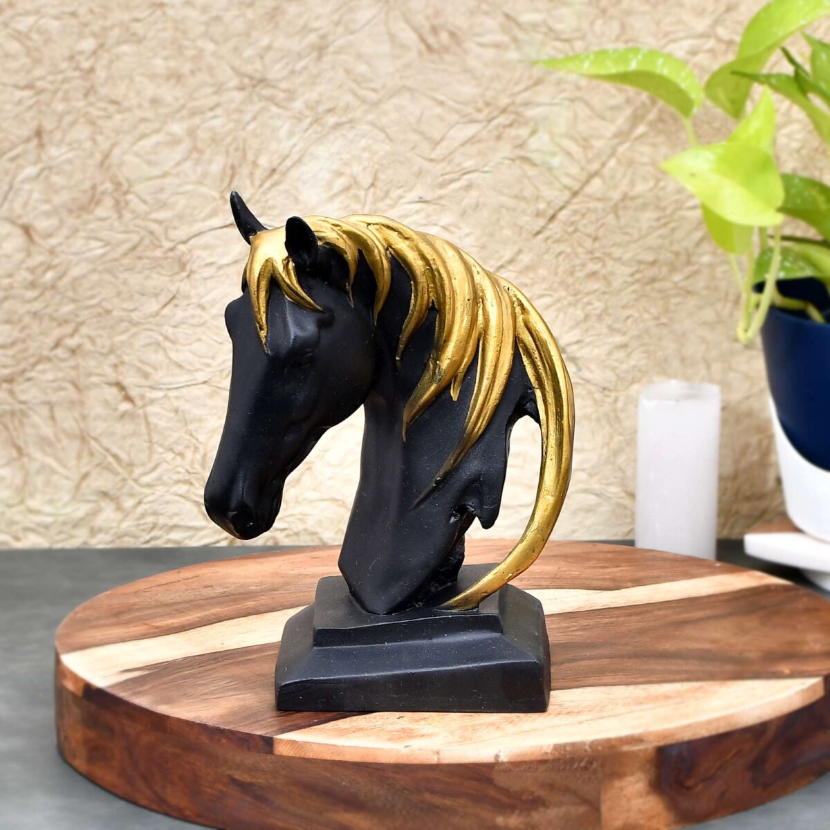 Horse head showpiece will be an enchanting home dcor object. The hand-carved horse head Polyresin showpiece involves an exquisite design and chiseled texture to give a graceful look to your home. The showpiece for home decor is out of the ordinary and unique showpiece for home decor. The stunning horse head figurine is an ideal showpiece for the living room, bedroom, drawing room, desktop, TV cabinet, and so on. The polyresin showpiece is a great gift for weddings, anniversaries, housewarmings, birthdays, Christmas, festivals, and others. Note : The Horse Head showpiece can be matched with other decorative objects from our collection to have an abstract decor setup.