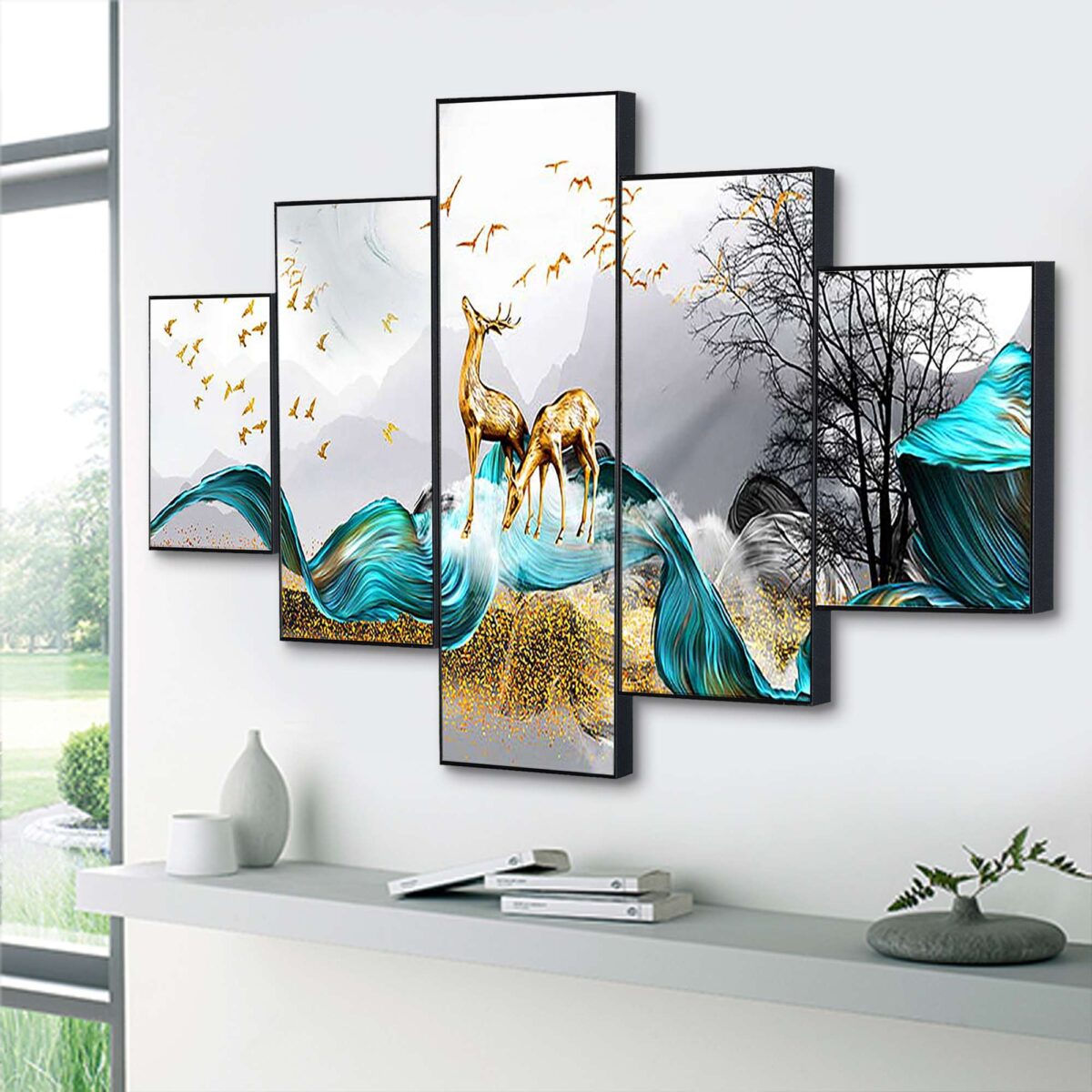praneeti Presents This Set Of 5 Amazing Paintings For Your Wall . The Painting Will Completely Change The Atmosphere Of The Room Whire It is Placed . The Paintimg Is Made On Heavy Wooden Board And Has A Digital UV Coating On It Which MAKES It Very Easy To Clean . Pricing Of The Product Is Made Very Reasonable From Our Brand As Per The Quality We Are Providing To Our Customers, We Assure That You Will Not Regret Your Purchase, praneeti Is Well Known for Its After Sale Services And In Case If You Feel Some Problem With Any Of Our Product Than You Can Replace It For Free With No Additional Cost . This painting offers a stylish look to your wall as this piece includes three themes it is vastu and also have the essence of abstract and modern art which makes this peice unique and stylish . The 5 pieces wall painting is made with high-quality material, the HD quality print looks fantastic and bright it will not fade easily. With just few simple steps you can mount it to the wall. Thank You For Yor Purchase